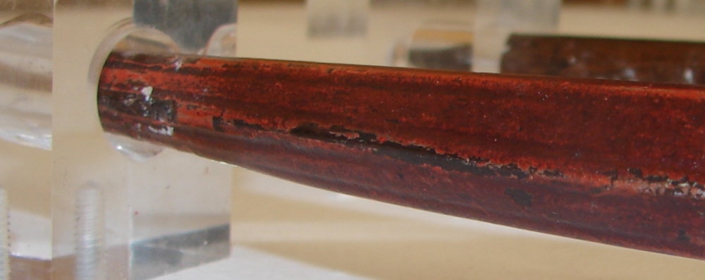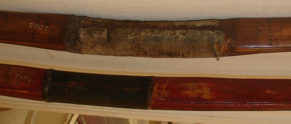 Das Zuggewicht wird bei Jagdbögen allgemein zwischen 50# und 80# gelegen haben, ich vermute das Zuggewicht des kürzeren Bogens auf ca. 60# das kann etwas täuschen wenn durch die aufgebrachte Farbe (möglicherweise ein Schutzlack des Museums) das Gewicht deutlich erhöht wurde.