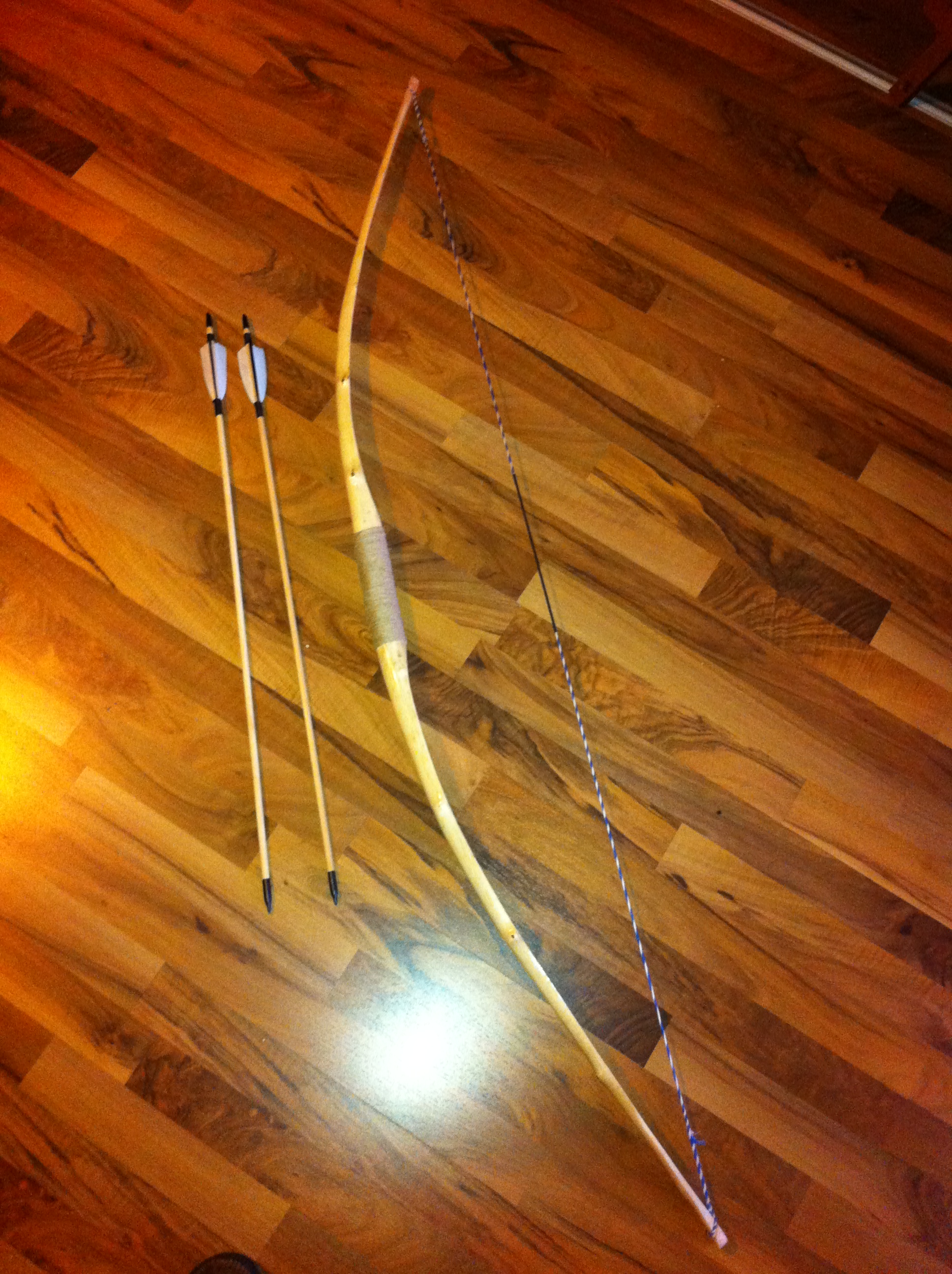 Wow sieht gut aus für den ersten.Nur schließe ich aus dem Bild mit Standhöhe, dass sich die Enden viel zu wenig biegen.Hab noch ne kleine Frage:Wie lang ist der Bogen und der Griff+Fadeouts?