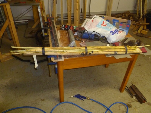Wetter schön also los, hab die ersten "Schäfte" beim Spaziergang mitm Hund gesammelt. Eigtl. wollt ich mich an Hasel halten war aber nicht zu finden deswegen gabs Eberesche und ??. Es wurde geschält und gebündelt. Und die ersten Spitzen...