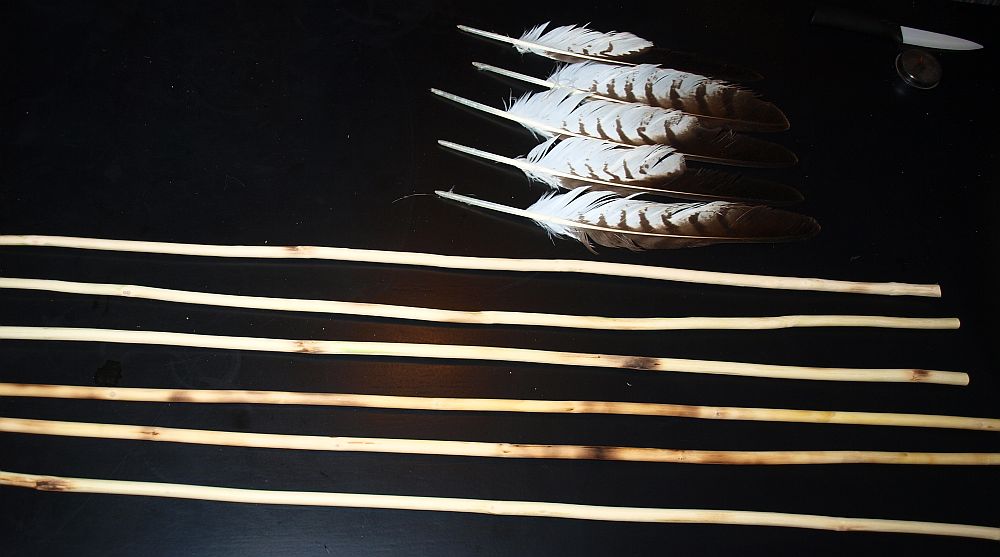 Ich habe meine 6 Hollerschößlinge nach einem Tag an der Heizung grob gerichtet und Federn vom Norddeutschen Steppenadler beiseite gelegt. Von diesen 6 Rohlingen werde ich die drei besten auswählen und weiter bearbeiten. Zuerst wird der Spinewert gemessen und der Schaft soweit verschlankt, dass ich auf einen Wert von 16-18 mm Durchbiegung komme.