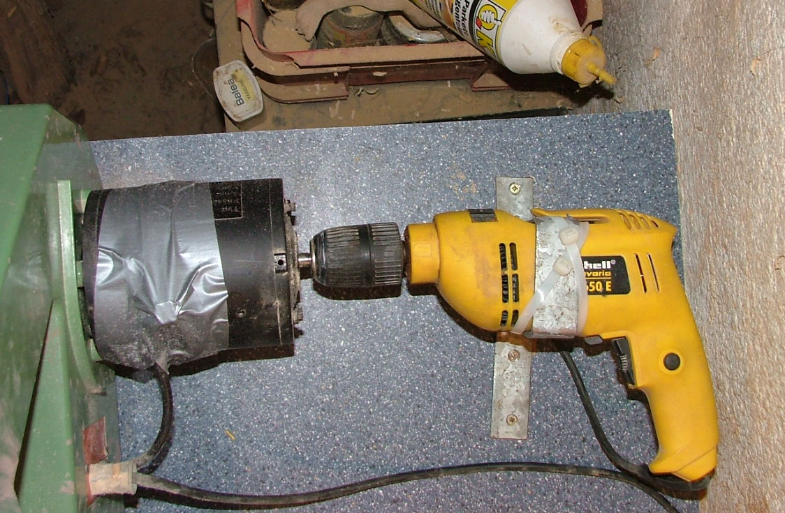 Er hat schnell festgestellt das der Motor der Bandsäge rettungslos verloren ist, aber der Motor hat eine durchgehende Welle die den Lüfter angetrieben hat, also den Lüfter abmontiert, Bohmaschiene mit Schnellspannfutter an die Welle geflanscht. Eine Halterung für die Bohrmaschiene aus einem Blumenkistenhalter gebaut (das mir ja keiner auf die Idee kommt meine Frau auf diesen kleinen Üebrgriff aufmerksam zu machen. Hm... das könnte noch Probleme verursachen aber andererseits, bis zum Frühjahr ists noch lang).