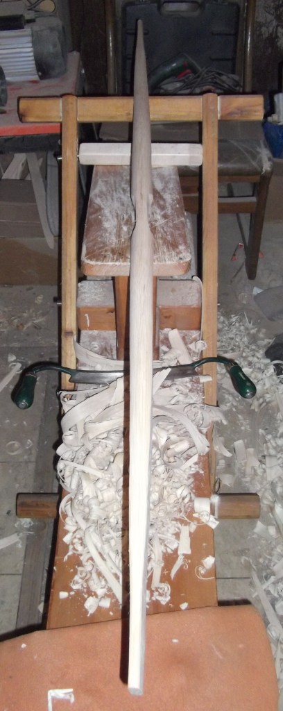 oder schlicht und einfach mit dem Bandschleifer bei und bringt das ganze in saubere und gleichmäßige Form, wobei man damit dann auch gleich die späteren Recurves verrunden und auf Maß bringen kann, daß Griffstück verrunden kann, etc...