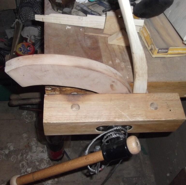 Jetzt wird der spätere Bogen Rückenseitig so an die Form geklemmt, daß der Radius der Form einigermaßen in Griffmitte ist.