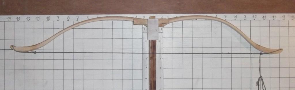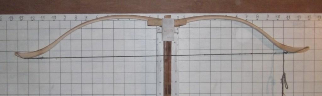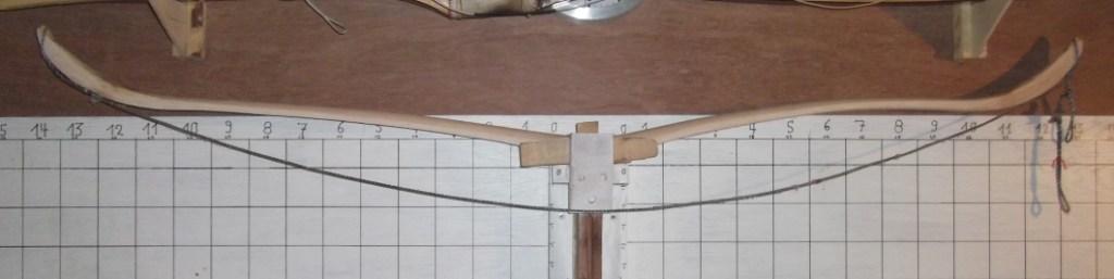 Ist eine saubere und gleichmäßige Biegung (beide WA sollten in etwa auf derselben Höhe an der Tillerwand liegen) der WA bei Standhöhe erreicht, kann die Sehne auf Ihre endgültige länge (mit der auch der später fertige Bogen zum Schießen aufgespannt wird) eingestellt und der Bogen zum endgültigen "Fertigtillern" aufgespannt werden.