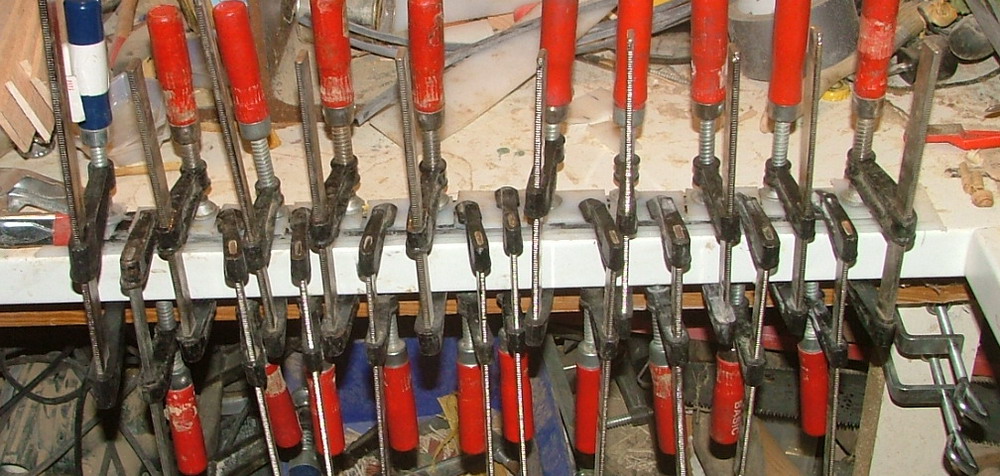 hier das Zusammenkleben der beiden Hauptstücke die aus jeweils 3 schon zuvor zusammengefügten Streifen bestehen
