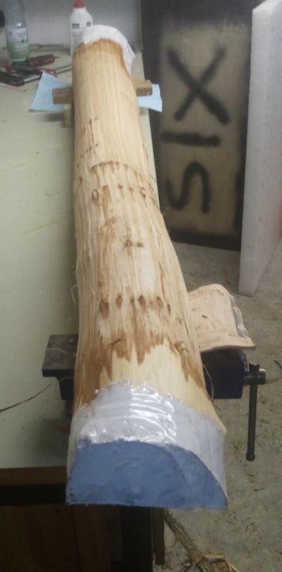 Unten mal ein Bild wie ich einen halben Stamm bereits fertiggestellt habe (so wie im markierten Bereich sieht der ganze Stave jetzt aus). Das zweite Bild zeigt die andere hälfte des Stammes wie er jetzt im Keller liegt (mit Bast, nur an den Enden ist der Bast weg und dort dann versiegelt).