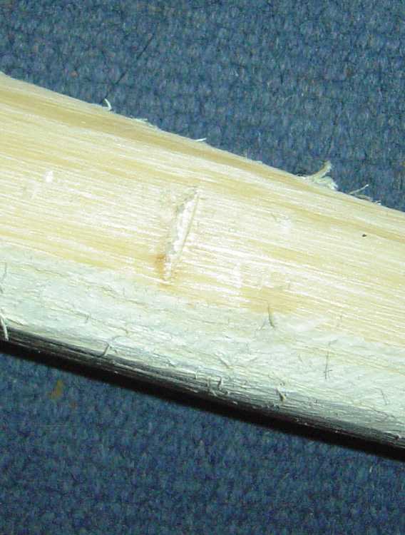 Danach mit dem Zugmesser noch etwas nachbearbeitet damít nicht zuviel Holz trocknen muss. Auch mit die Japansäge ein Entlastungsschnitt durch den Griff gemacht. Dadurch reißt das Holz hier hoffentlich nicht unkontrolliert (beim letzten Sapturnier vom Rabe abgeguckt