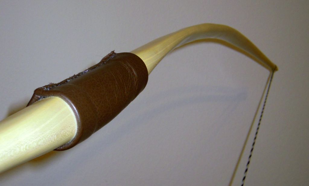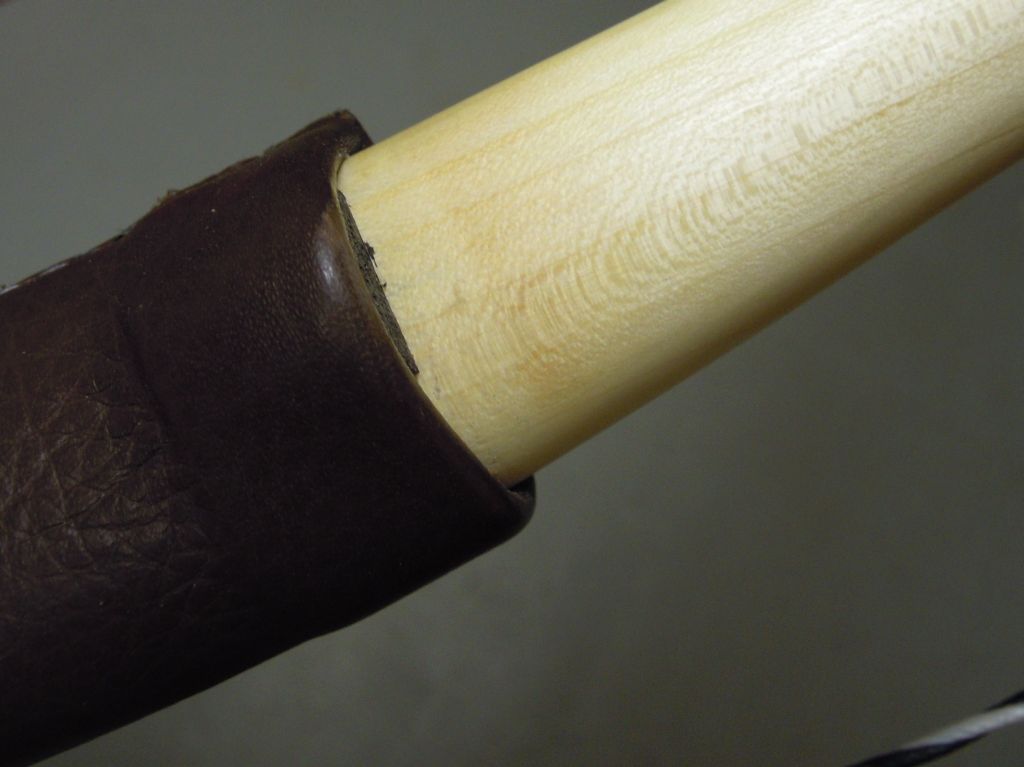 Griff: Leder mit Pfeilauflage aus zugeschnittenem Dickleder, aufgeklebt mit UHU Kraft, zusätzlich mit Dacron genäht