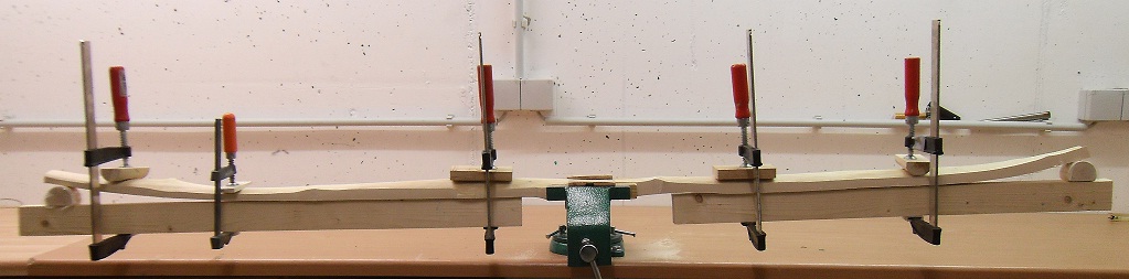 Um dann Links auch den "natürlichen" Recurve zu bekommen, habe ich den B. etwas in die Form gezwungen, in der Hoffnung, dass er sie annimmt. Ich hoffe dadurch auch den Drehwuchs daran zu hindern beim Trocknen einen Korkenzieher zu produzieren.
