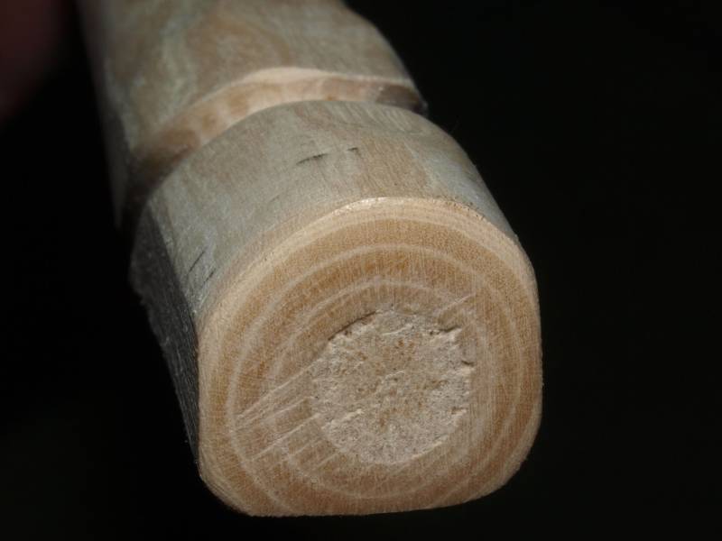 Nachdem der erste Hollerbogen schießt, aber mit 26 lb zu schwach ist, habe ich die beiden restlichen Stäbe für einen zweiten Vollstab-Bogen verwendet. Die dicken Enden im Griff gespleißt, Spleißlänge rund 18 cm. Meine Bauzeiten sind deswegen so kurz, weil ich den ganzen, vollen Stab verwende ohne viel runterzuarbeiten. Zudem verwende ich eine konkave Hobelklinge zum Abschaben von Rinde und Holz: Das geht verdammt schnell, viel schneller als jeder Handhobel.