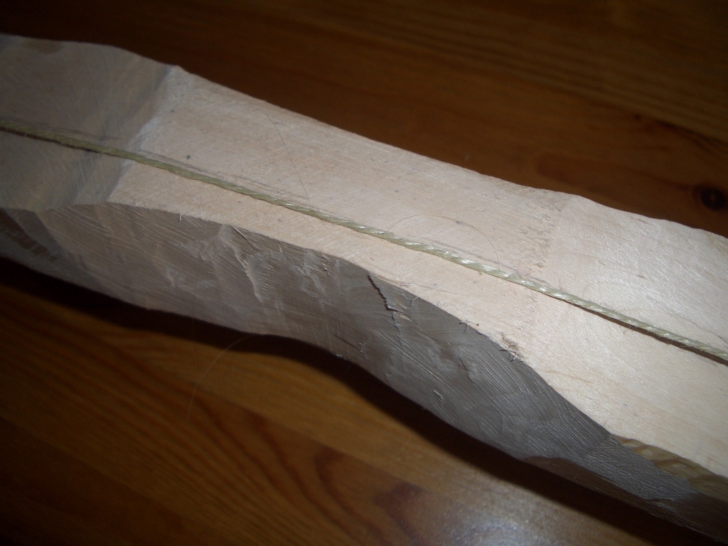 Diesmal hat es tatsächlich funktioniert. Ich glaube neben der Geschwindigkeit war noch hilfreich, dass ich durch die Zwingen die Biegung direkt im Griff erzwungen habe. Ich hatte vorher schon den Eindruck, dass der ganze Wurfarm ein wenig mitgearbeitet hat. Zwar hat der Wurfarm beim Ausspannen an den Tips wieder ca. 2 cm nachgegeben, dass reichte aber immer noch, um den Sehnenverlauf statt rechts vom Griff ein wenig links von der Mitte zu platzieren. So mag ich das. Da, wo der Griff auflag, hat er zwar ne Delle bekommen, die ist aber beim Ausarbeiten der Griffform rausgefallen.
