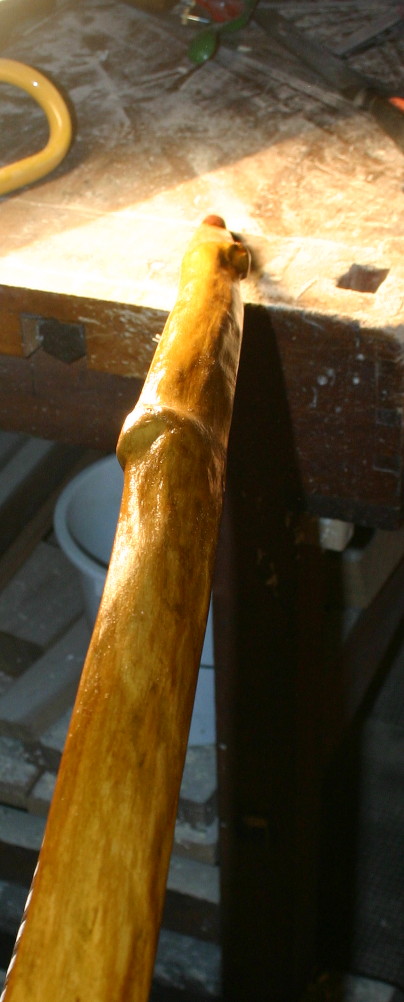 Nachdem das Holz einigermaßen trocken ist, habe ich beim ersten Stab (dem auf dem "Gruppenbild" ganz rechts) die Form herausgearbeitet. Er ist leicht snaky, leicht seitlich verzogen und hat sich auch noch wieder etwas verdreht..: