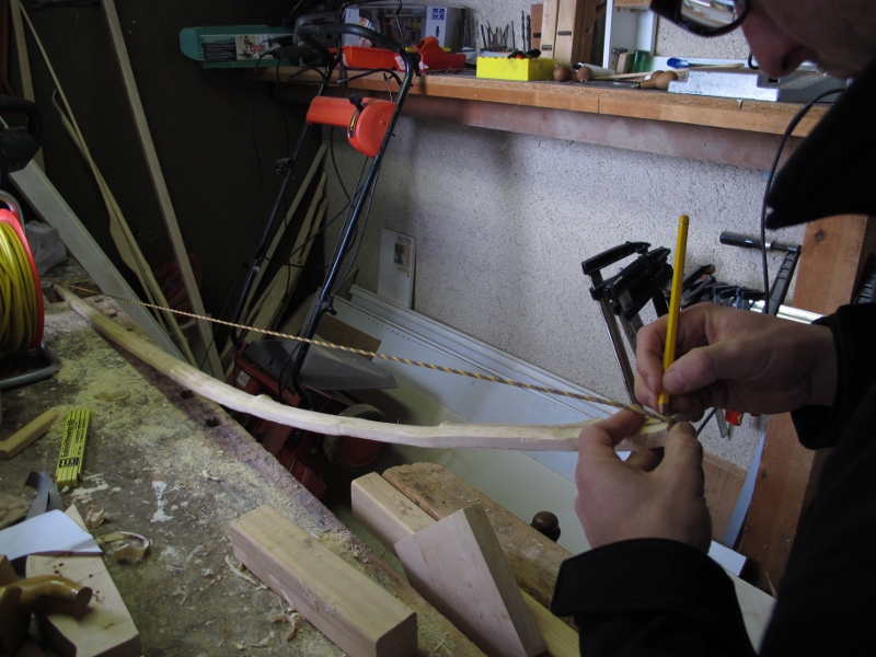 Der Breitenverlauf des Bogens wird angezeichnet. Die Tips bleiben aber mit 2cm noch breiter als angedacht. Im unteren Teil des Fotos der Griffbereich.