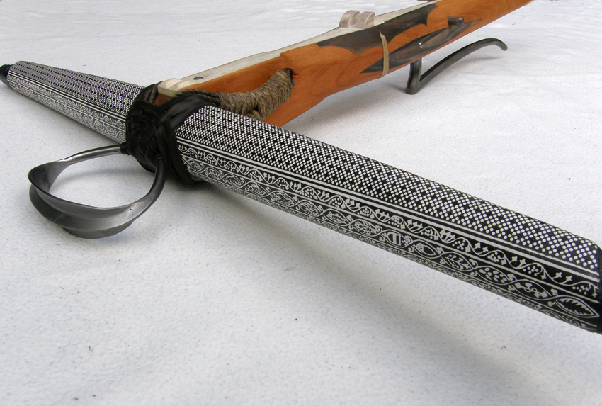 Hornbogen mit bedruckter Birkenrinde, Zuggewicht ca 500kg, Einlagen aus Hirschgeweih und Steinbockhorn.