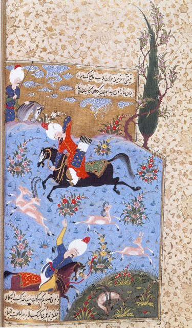 Oha, und noch ein Bild! Aus einem persischen Manuskript, ein Divan (Gedichtsammlung) des Hafez, 16. Jahrhundert. Man beachte wieder den Reiter im unteren Bildteil: