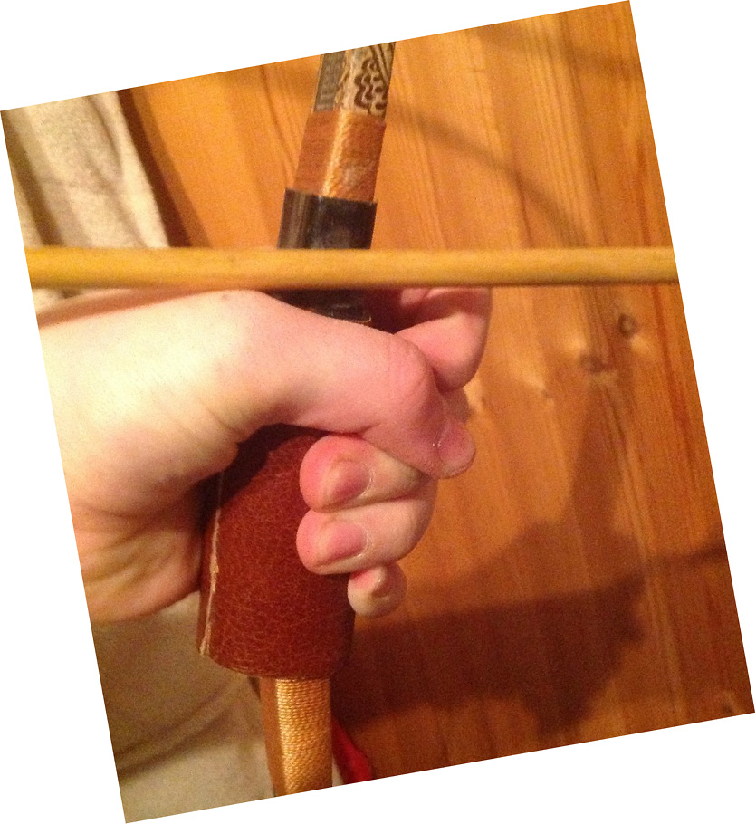 Und zur rechten Hand: Unterarm in Verlängerung des Pfeils (Ellbogen ist auf einigen meiner Bilder zu hoch), wo und wie man greift gibt es wohl mehr als eine Wahrheit (ich habe z.B. den Ring direkt unter dem Pfeil), da gibt es viele Varianten und man muss eine finden, die zur eigenen Anatomie passt.