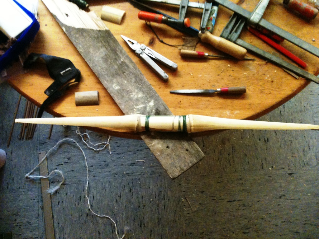 Bei meinem Bambus musste ich feststellen, das ich eine bestimmte Stärke (ca. 4-5mm) in Wurfarmmitte stehen lassen musste. Sonst haben die Fasern keinen Halt mehr und es knackt. Ich habe dann über die Seite und Kante getillert. Dadurch wurde er zum Ende recht schmal und ich hatte nicht mehr genügend Material für Sehenkerben. Hab mir dann aus Abschnittresten Tips gebastelt und mit Uhu Endfest aufgeklebt. Den Griffbereich habe ich erstmal gar nicht bearbeitet. Wollte nach den ersten Versuchen nicht so viel Arbeit investieren und hab mich ganz auf die Wurfarme konzentriert. Nachdem ich gemerkt habe, das es klappt, habe ich das so gut es eben noch ging zusammen gebastelt. Werkzeug: Feile, Messer, Säge und ein bisschen mit der Proxon.