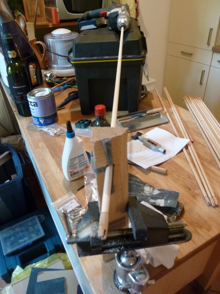 Links neben der Lade liegt eine quick-n-dirty Pfeilführung für das Drehen/Schleifen der aufgeklebten Holznocken. Die Filzstreifen verhindern, dass der Pfeilschaft sich irgendwelche Druckstellen holt. Das sah in Aktion so aus: