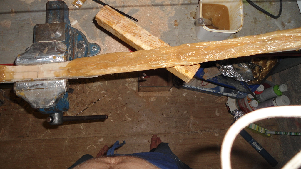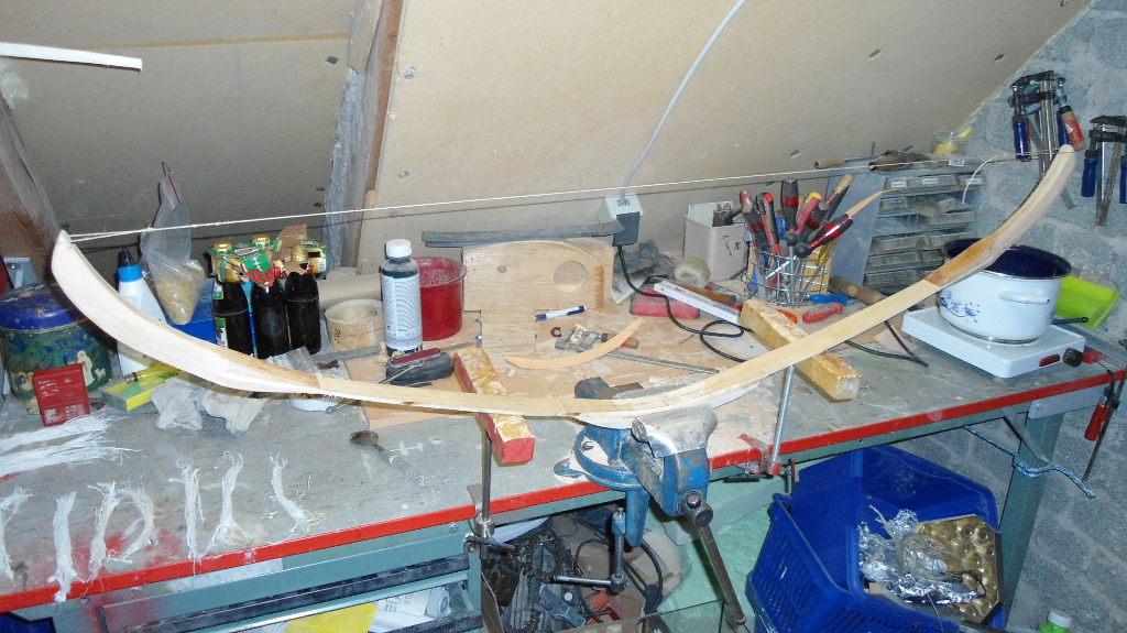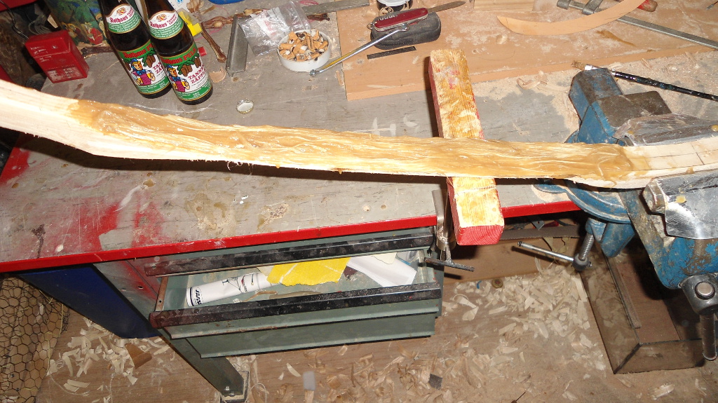 Man kann auch Schraubzwingen nehmen, wenn man genügend hat. Der Bogen ist ja relativ schmal. Die Sehnenschicht durch Auflage von einem dünnen Holzfurnier schützen.