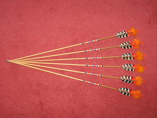 Holzpfeile Fichte, Gesamtlänge 75,5 cm, gebarrelt, An der Spitze von 5/16 auf 11/32 auf einer Länge von 7 cm und am Nock von 11/32 auf 5/16 auf einer Länge von 31 cm. Spitze 70 grain, 4" Befiederung Saubuckel, Federn gespleisst Gewicht des 18teiligen Satzes von 28,9 bis 30,5 Gramm. Der FOC liegt bei 5%. (Ja ich weis das ist nicht viel aber ich tue mir bei einer geraderen Flugbahn leichter) Cresting mit Edding Stiften. Endbeschcihtung 2 x wasserverdünnbarer Lack Seidenmatt.