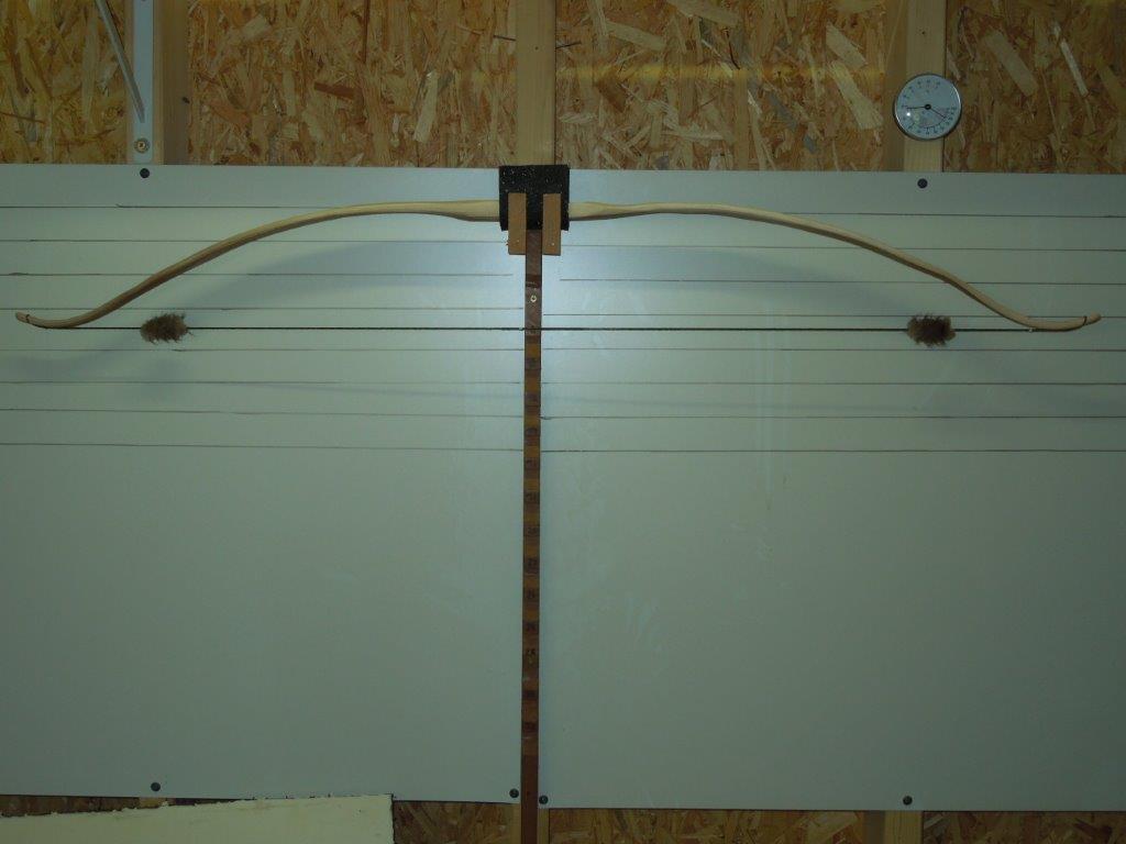 Projekt A (Osage mit Sehne) hat heut nach genau 1 Monat Trockenzeit wieder 120 Pfeile geworfen, der Tiller hat sich nicht verändert, er passt noch, aber das Zuggewicht von 40# bei 27" ist zu niedrig.