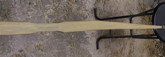 Heute habe ich den Bogen grob aus dem Stave geholt. Erst mal so wie angezeichnet die Breite ausgearbeitet und dann noch in der Stärke reduziert. Als ich ihm dann schon mal über den Bogenrücken schauen konnte, habe ich nach längerem hin und her noch einen guten halben cm in der breite abgenommen. Jetzt ist er gut 45 mm am Fadeout und pyramidial zu den Tips verjüngt, ein bißchen Charakter hat er auch O0 .