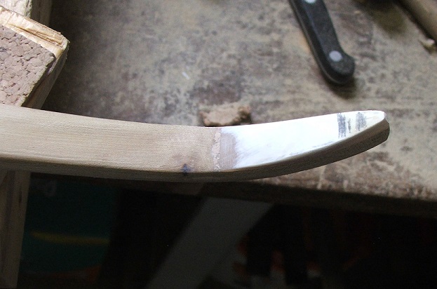 Schnell mal wieder ein Update und eure Meinung zum Tiller ist auch gefragt. Habe das Horn auf den Tips und grob in Form gebacht. Der Bogen ist jetz 1,86 m über alles und 1,82 m N to N, 49 mm an den Fades und 10mm an der Sehnenkerbe, die ersten 10 cm fast parallel und dann eine Pyramide. Er zieht jetzt gut 50# auf 26" und wiegt, haltet euch fest, 830 Gramm :o .