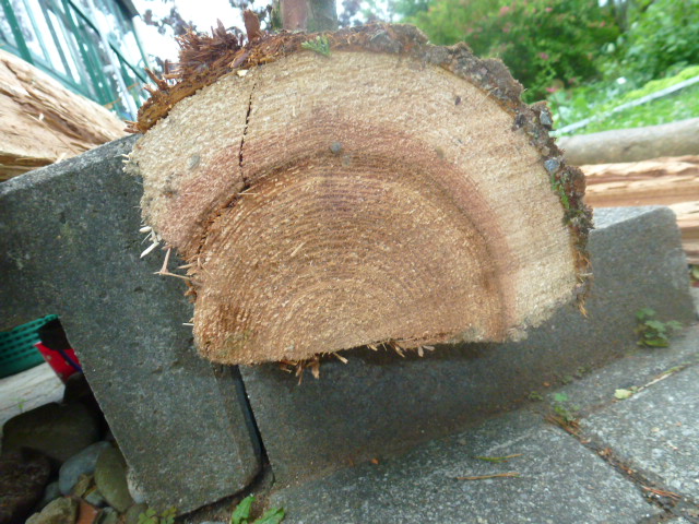 Wegen allem dem dachte ich zuerst, das Holz sei schon faul. Riecht aber nicht faul sondern eben nach Thuja und hat noch Harz. Im Internet habe ich gelesen, spezifisches Gewicht von Thuja sei sehr niedrig. Daher scheint es mir, doch nicht faul zu sein. Ich lasse es mal trocknen und dann sehe ich weiter.