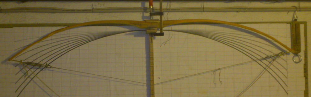 nun gings ein paar Stunden mit tillern dahin uns schließlich ist die Standhöhe erreicht. Dieser Bogen wäre ohne mein einhängbares Stahlseil mit den Wantenspannern in diesem Augenblick unweigerlich zerstört worden, beim langsamen Übergeben des Zugs auf das Stahlseil hab ich sofort gemerkt dass ein Wurfarm viel zu stark ist, dieses Ungleichgewicht wirkt sich bei so starkem Reflex auf Standhohe fatal aus, der stärkere Wurfarm streckt sich und wäre sicherlich umgeschlagen hätte ich nicht sofort wieder mehr Zug auf die lange Tillersehne gegeben.