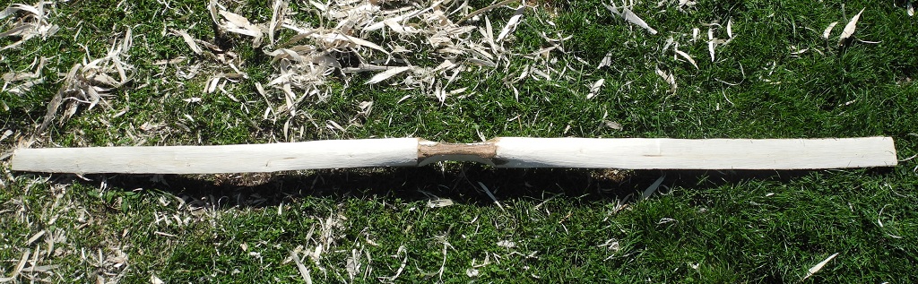 Der Rohling ist sicher nicht perfekt, aber er hat eine akzeptable Länge und an keiner Stelle starken Drehwuchs. Statt zu spalten, schabe ich - zwei Staves würde der eh nicht hergeben.