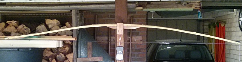 Jetzt heißt es tillern. Leider biegt er sich nicht so gut wie erhofft und ich muss ein wenig nacharbeiten, das wird aber. Änderungen nimmt der Bogen brav und vorhersehbar ein, einzig die leichte Verdrehung macht mir noch Sorgen. Ich hoffe, die bekomme ich so hin das sie im Auszug nicht stört. der Bogen ist beim Verleimen nämlich etwa 3-5mm aus der Richtung gekommen und somit ganz leicht verdreht in einem Wurfarm. Evtl wirkt sich das aber nicht auf den Auszug aus. Dann habe ich Glück.