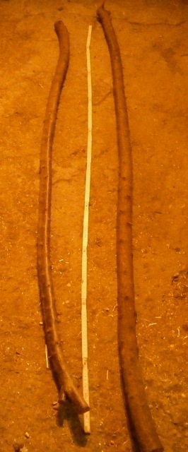 Habe letzthin neben Hasel und einem krummen Ding, was wahrscheinlich Elsbeere heisst auch noch zwei ziemlich lange Schwarzdornstämmchen nach Hause geschleppt und an die beiden trau ich mich nach näherem Zusehen nicht so recht ran... Daher jetzt mal die Frage: wie umgehen mit so dichtem, harten Holz (3,6kg) Wie lagern? Noch nass spalten? Obendrein haben die Beiden einen völlig unrunden Querschnitt - als wären sie plattgewalzt...Was mach ich mit diesem abgeflachten Querschnitt. Es böte sich ja vielleicht an den zukünftigen Bogen so in diesen plattovalen Querschnitt zu legen, dass die flacheren Flanken jeweils Bauch und Rücken werden - also nicht spalten!?? - aber gerade in dieser Richtung sind sie so grässlich krumm Würde ich sie spalten, dann wohl eher so, dass der Stave möglichst grade wird-? Oder?? Das hiesse dann aber längs durch die breiteren Seiten ... Das gäbe dann einen super gewölbten D-Rücken und einen extra schmalen B.Bauch- Hm! Fragen über Fragen...