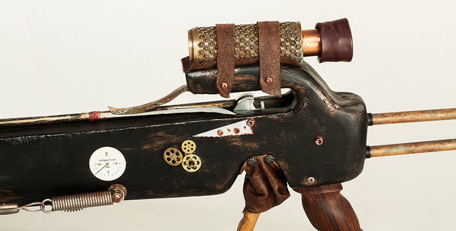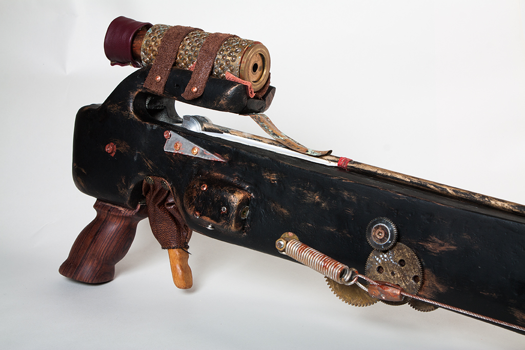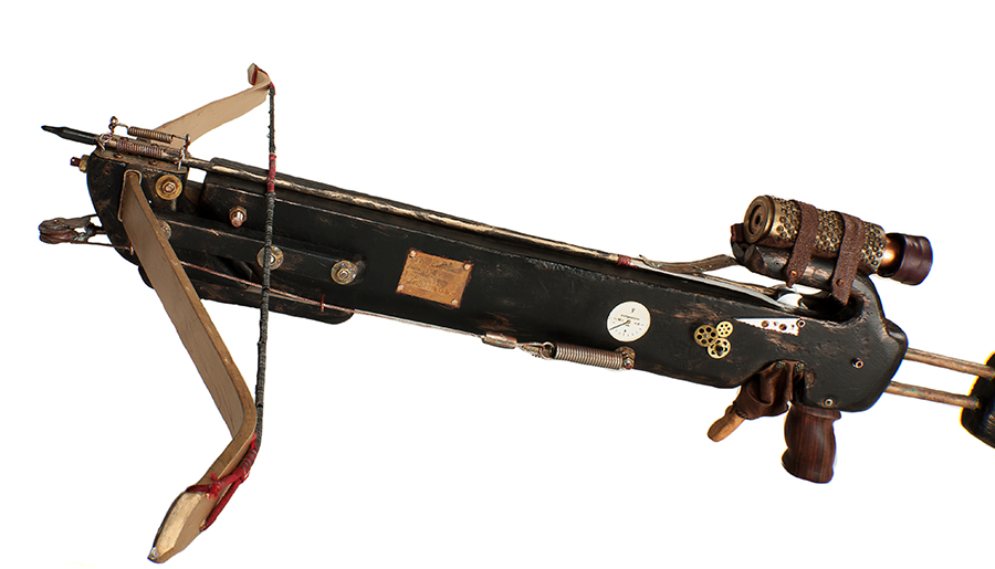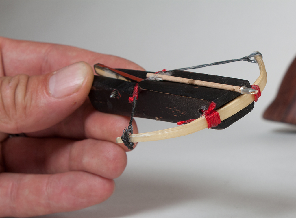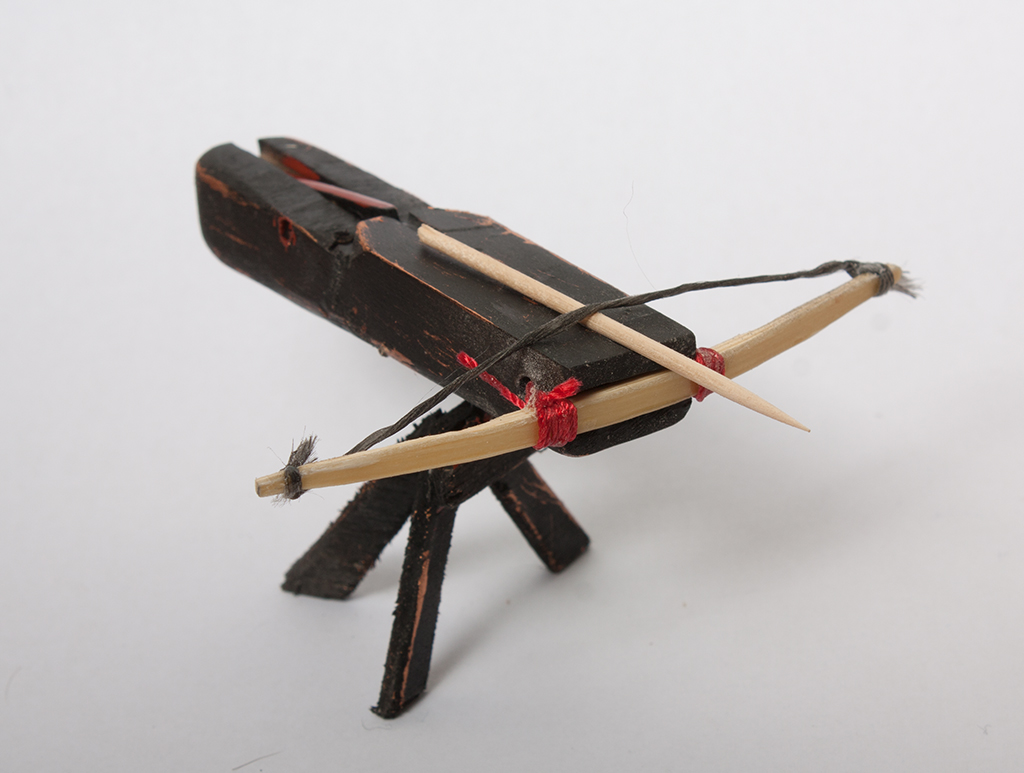 Die Kleine ist ne 9 cm lange "Zapfenarmbrust" und verschiesst tötliche Zahnstocher oder brutale Brandbolzen in Form von brennenden Wattestäbchen! Der Bogen wie immer laminiert..der Rumpf aus Buche und das Untergestell aus banalem Sperrholz!