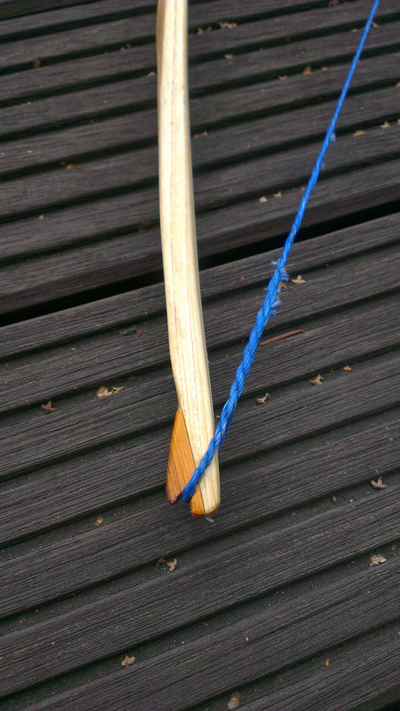 Auch auf der anderen Seite der Pfeilauflage muss noch etwas Holz weg: Dann mal ab damit auf den Tillerstock. Wer genau hinschaut, bemerkt, dass der Bogen etwas schief aufliegt und der Haken nicht genau dort zieht, wo der Pfeil aufgelegt wird. Das liegt daran, dass ich den Bogen am Griff nicht einklemmen kann. Neugiers Design ist hier deutlich praktischer, wegkippen kann er bei ihm ebenso wenig. Fast im Vollauszug. Bitte kommentieren, falls jemand was anderes beobachtet. Die Enden sind noch zu steif, das erste Drittel oben (linke Seite) darf sich noch etwas mehr biegen.