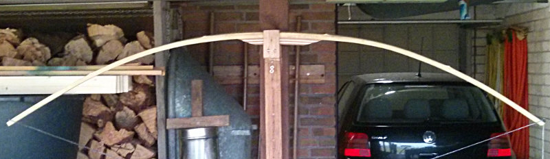 Jetzt heißt es tillern. Leider biegt er sich nicht so gut wie erhofft und ich muss ein wenig nacharbeiten, das wird aber. Änderungen nimmt der Bogen brav und vorhersehbar ein, einzig die leichte Verdrehung macht mir noch Sorgen. Ich hoffe, die bekomme ich so hin das sie im Auszug nicht stört. der Bogen ist beim Verleimen nämlich etwa 3-5mm aus der Richtung gekommen und somit ganz leicht verdreht in einem Wurfarm. Evtl wirkt sich das aber nicht auf den Auszug aus. Dann habe ich Glück.