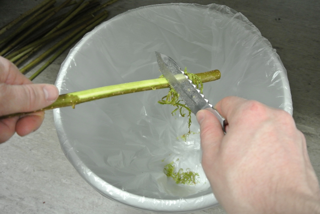 Die Rinde habe ich mit einem, nicht all zu scharfen, Messer abgeschabt. Dabei kann man auch ruhig "mit väterlicher Strenge" vorgehen. Dann ist so ein Schaft in unter zwei Minuten entrindet und Knospen schrubbt man so einfach weg. Am glattesten wird das Ergebnis meiner Meinung nach, wenn man vom dicken zum dünnen Ende arbeitet.