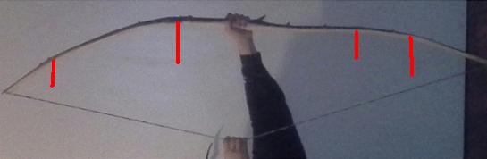 Denk Dir eine ideale Ellipse (oder Kreissegment) für Deinen Auszug z.B. 13", denke Dir eine weitere für Deinen Auszug z.B. 15", wandere den WA entlang bis zu einer Position, sagen wir z.B. 400mm, miss genau dort den Abstand zwischen den zwei idealen Ellipsen, nehmen wir an, dass er dort 80mm ist. Nun spann Deinen Bogen auf, mach Fotos von zwei Auszügen und miss den Abstand zwischen den beiden Auszügen. An der Stelle (400mm) sollte sich bei guter Biegung ein Wert von ungefähr 80mm ± einstellen. Das kann man an jeder beliebigen Position der WA machen und auch bei sehr verbogenen Krücken die SEHR steifen oder SEHR weichen Stelllen feststellen können. Deutlich weniger als 80mm bedeutet zu steif, deutlich mehr zu weich.