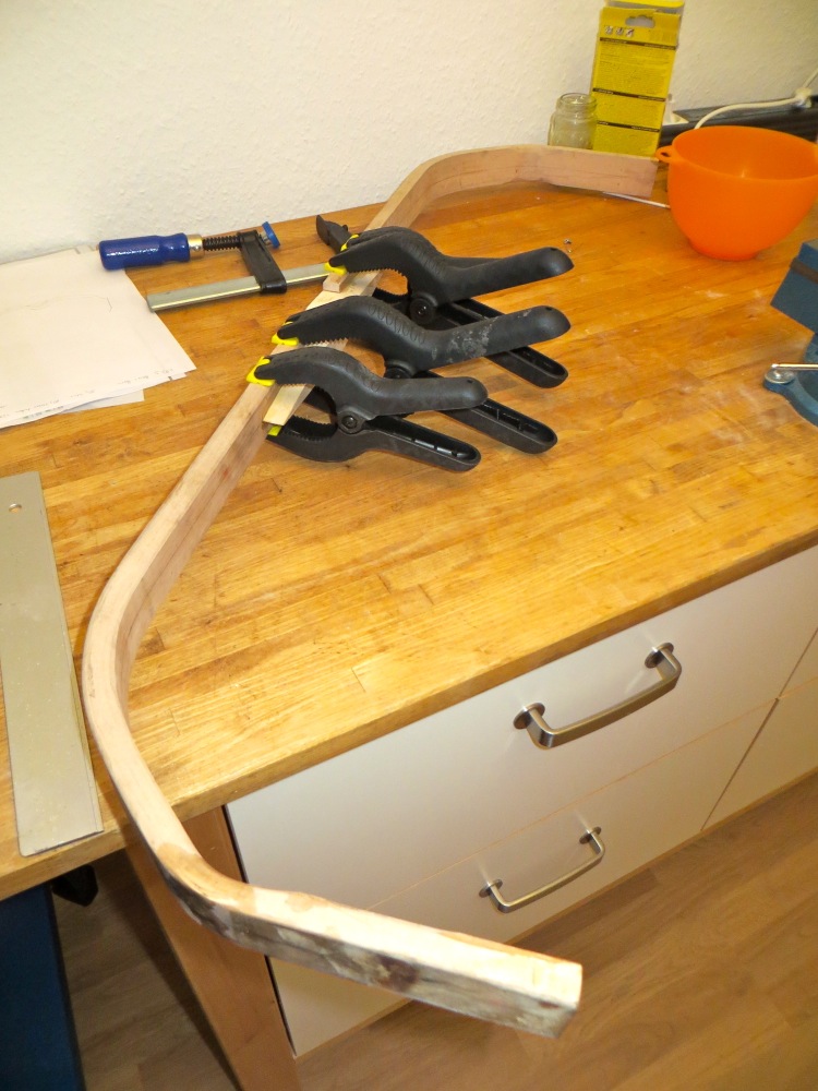 Die Wurfarme sind aus luftgetrocknetem Spitzahorn, tolles Holz, von dem ich mir viel verspreche. Die Leisten fielen etwas schmaler aus, weswegen es darauf ankam, die Spleisse sauber auszurichten. Ein paar Grad Abweichung hier, und am Tip könnte die Mittellinie seitlich auslaufen… Scheint aber gut gegangen zu sein. Ach ja - ich habe für die Spleisse diesmal Expoxy genommen. Die Hemmungen fallen