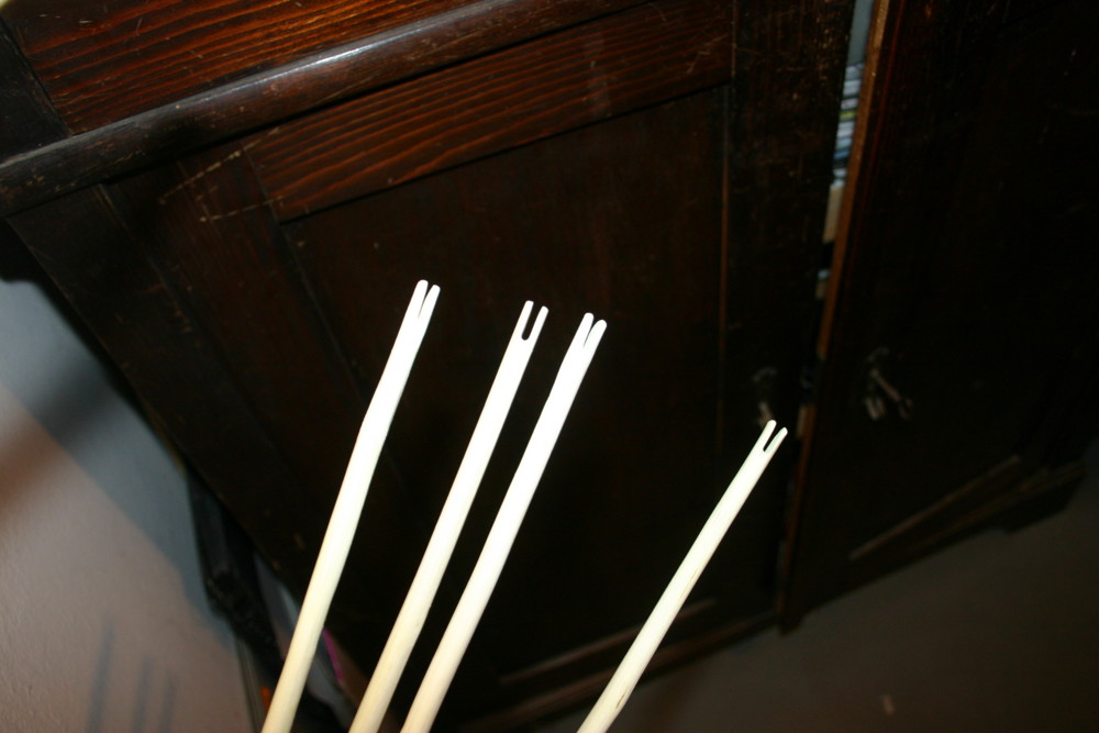 Und weiter gehts. Inzwischen sind fünf Schäfte bespitzt, benockt und z.T. gebeizt und somit fertig für die Befiederung. Von den zwei übrigen Schäften ist einer fertig geschnitzt, der letzte wartet noch auf "Verdünnung". Die beiden werden dann auch noch mit Nocken und Spitzen versehen. Wegen des dicken Markkanals auf Nockseite muß ich wohl noch zwei Inserts vorbereiten und verkleben.
