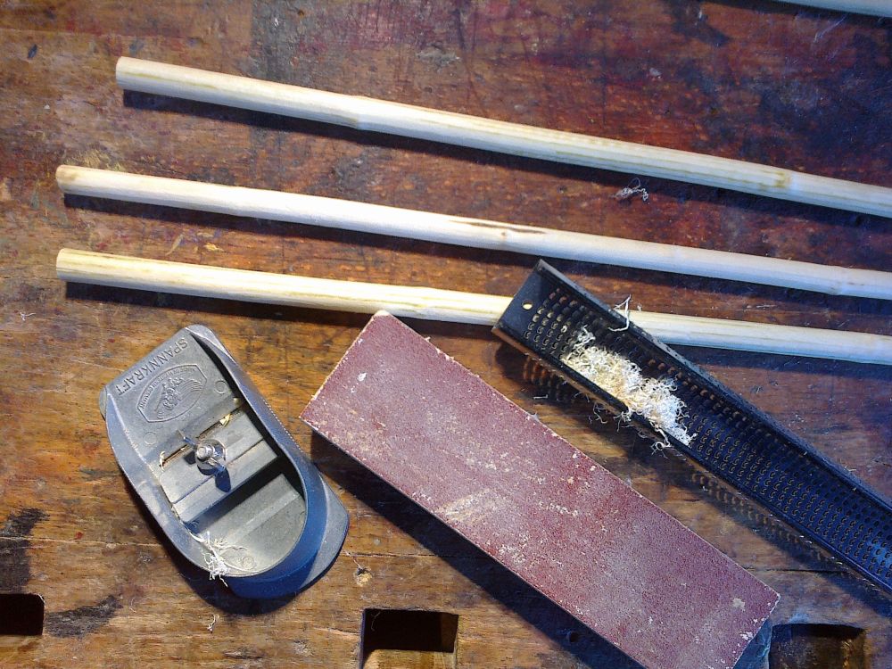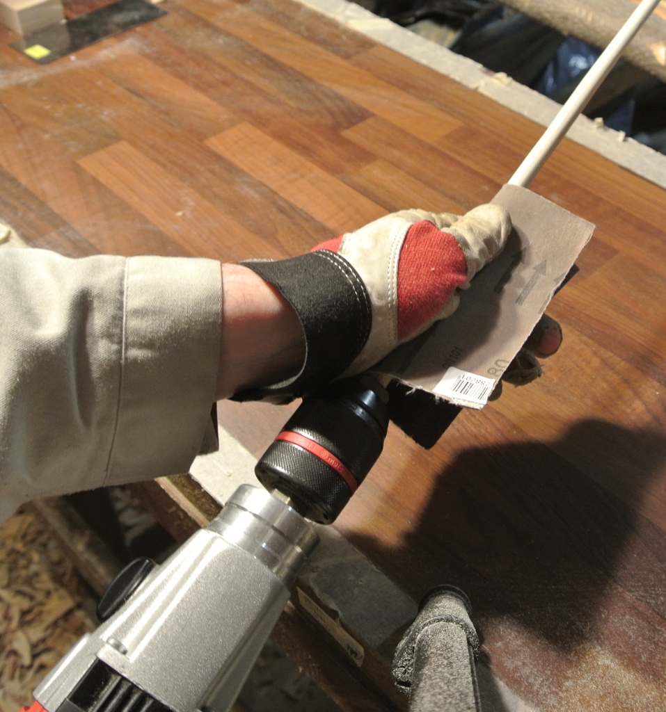 Da ich auf recht dicke Prügel zurückgreifen musste, wurden die erstmal mit Bohrmaschine und 80er Papier auf ein biegbares Maß heruntergeschmiergelt.
