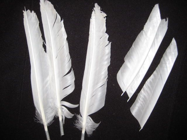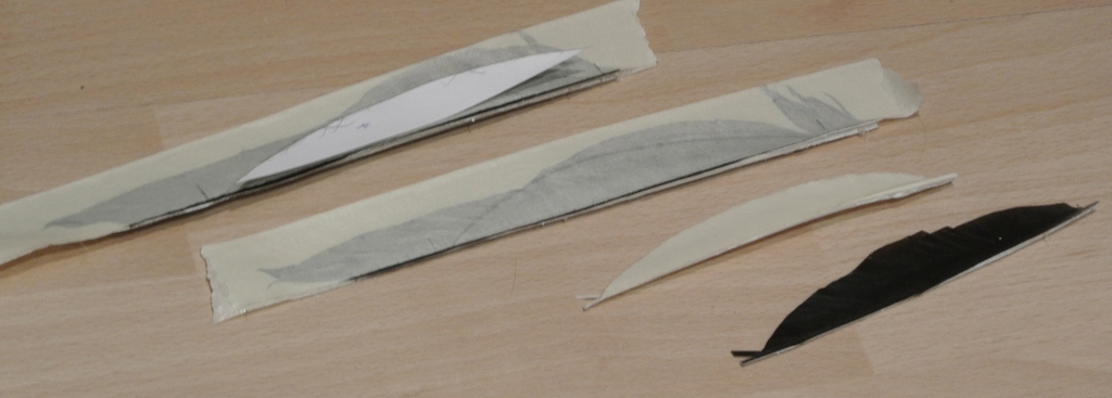Die Federn stammen von den glücklichen Flugenten meines Onkels. Mittig aufgespalten, zugeschnitten, dann in einer Befiederungsklammer schön plan geschliffen.