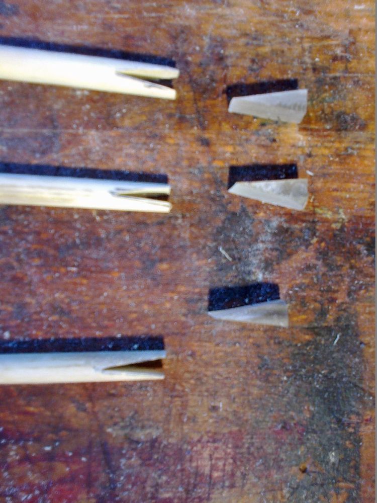 Als Nocks habe ich kleine Keile aus hübschem grauen, durchscheinenden Kuhhorn hergestellt und in die Schäfte eingeklebt mit 5-min-2K von Uhu.