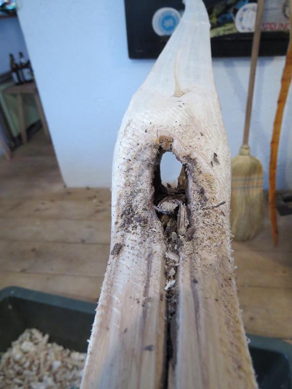 Zu Tage kamen bei der Esche ein paar nette Stellen. Eingewachsener Ast im UWA Leichte Verwachsung Übergang Griff/ OWA dann kam der Durchbruch . Eingewachsenen Ast im UWA etwas zugeraspelt zum Schluß eine Seitenansicht. Sonntag 19 Uhr wieder runtermarschiert. Schnee bei den Wachten zum Teil bis zum Schritt.