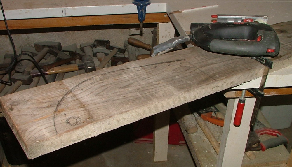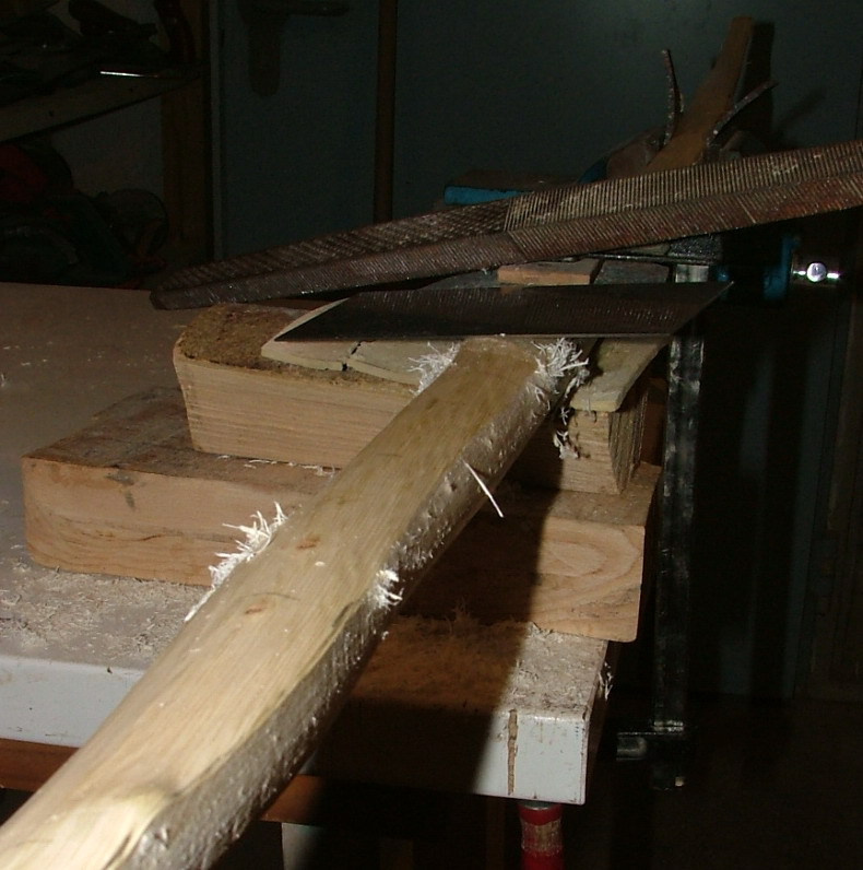 Das Verrunden hab ich mit der Hufraspel durchgeführt nachdem Ulme in nassem Zustand extrem fasert und ein Teil der Fasern bei Ulme bekanntlich kreuz und quer verläuft. Nach der Hufraspel sieht das Holz aus wie ein Igel und wurde deshalb mit der Ziehklinge abgezogen.