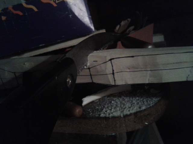 Um hier Zeit zu sparen, hab ich ihn erst eingesägt und dann einen großen Teil mit dem Ziehmesser rausgespalten(sorry für die Quali, Akku war fast leer=> kein Blitz)