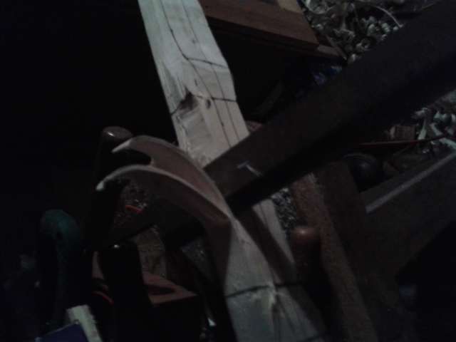 2. Verkeile den Griff in der Auflage und binde ihn fest oder setze - wenn möglich - ne Zwinge dran. (Natürlich Leder oder Holz zwischen legen!)
