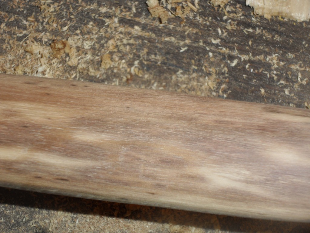 Das Kernholz ist bei der Robinie deutlich dunkler als der Splint, beim Runterarbeiten mit dem Ziehmesser scheint dann das dunkle Kernholz durch, wenn der erste Kernholzring nur stellenweise angeschnitten ist. Ist auf den leider unscharfen Fotos schwer zu erkennen.