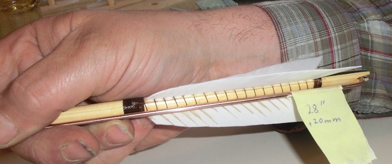 Erst jetzt wird der Pfeil auf die richtige Länge gekürzt, als Maß nehme ich gerne einen Schweißdraht mit 90° Winkel, der in die Nockkerbe kommt. Der Draht muß dann die Länge des Auszuges plus der Länge für die Spizenmontage haben.