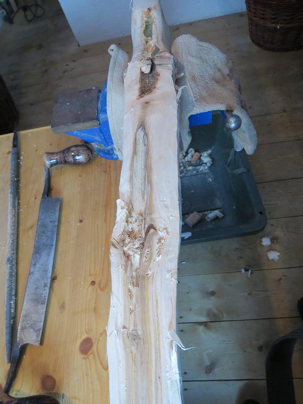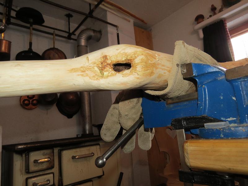 Zu Tage kamen bei der Esche ein paar nette Stellen. Eingewachsener Ast im UWA Leichte Verwachsung Übergang Griff/ OWA dann kam der Durchbruch . Eingewachsenen Ast im UWA etwas zugeraspelt zum Schluß eine Seitenansicht. Sonntag 19 Uhr wieder runtermarschiert. Schnee bei den Wachten zum Teil bis zum Schritt.