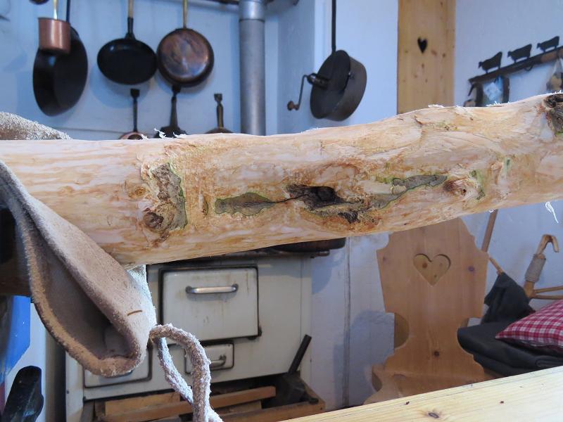 Ich find ein geiles Stück Holz Nettes Detail mit Zweiglein und Knospe Daheim nach der Schälung Unterer WA innen a bissl verfault. schau ma moi